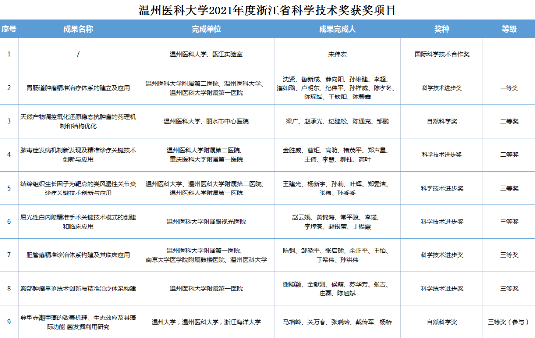 7月11日,全省科技创新大会在省人民大会堂举行。大会颁发2021年度浙江省科学技术奖306项,公司及附属医院共获一等奖1项,二等奖2项,三等奖5项(含参与1项)其中沈贤教授团队项目成果“胃肠肿瘤精准诊治关键技术创新和应用”获省科学技术进步奖一等奖。宋伟宏院士获浙江省国际科学技术合作奖。