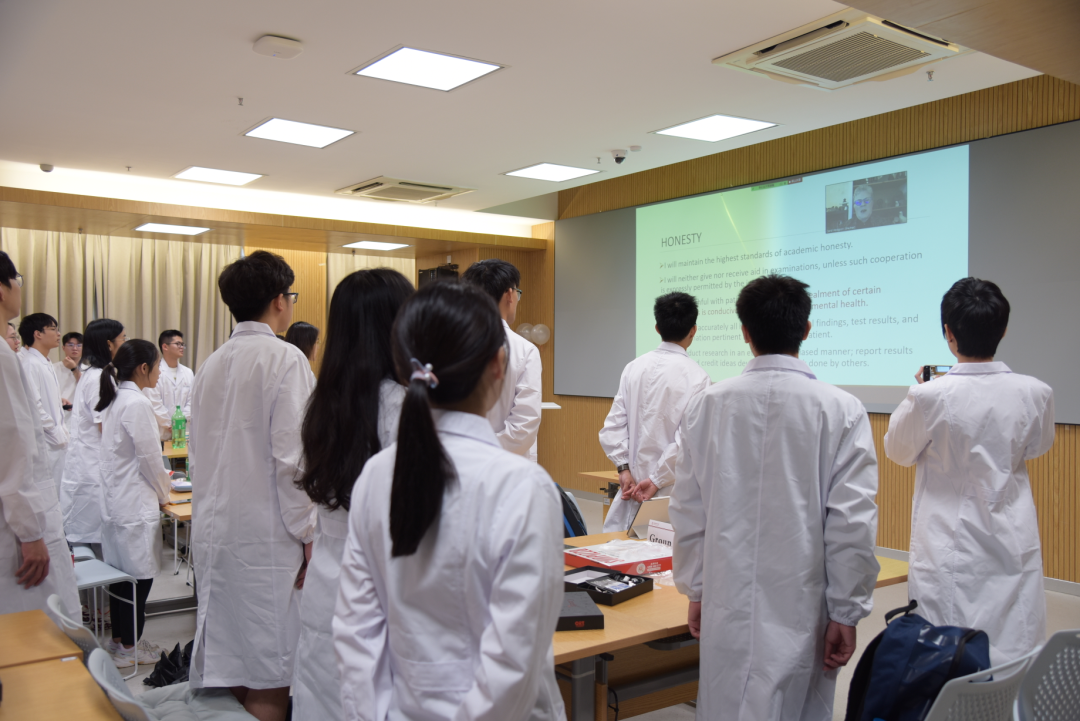 活动中,Tracey Hillier教授和Carol Hodgson教授带领同学们共同庄严宣誓。与以往医员工宣誓所使用的《希波克拉底誓词》或《中国医师宣言》不同的是,本次宣读的医学誓言是由同学们集体起草完成的,涵盖了诚实、尊重、保密和责任四个方面的内容,总计包含30项条款。除了医学誓言的基本职业道德要求之外,还囊括了学术学风、朋辈氛围、职业态度等多方面行为准则的详细规定,展现了同学们作为新时代医员工的庄严承诺和对医生这一职业新使命和新责任的崭新理解与自我约束。