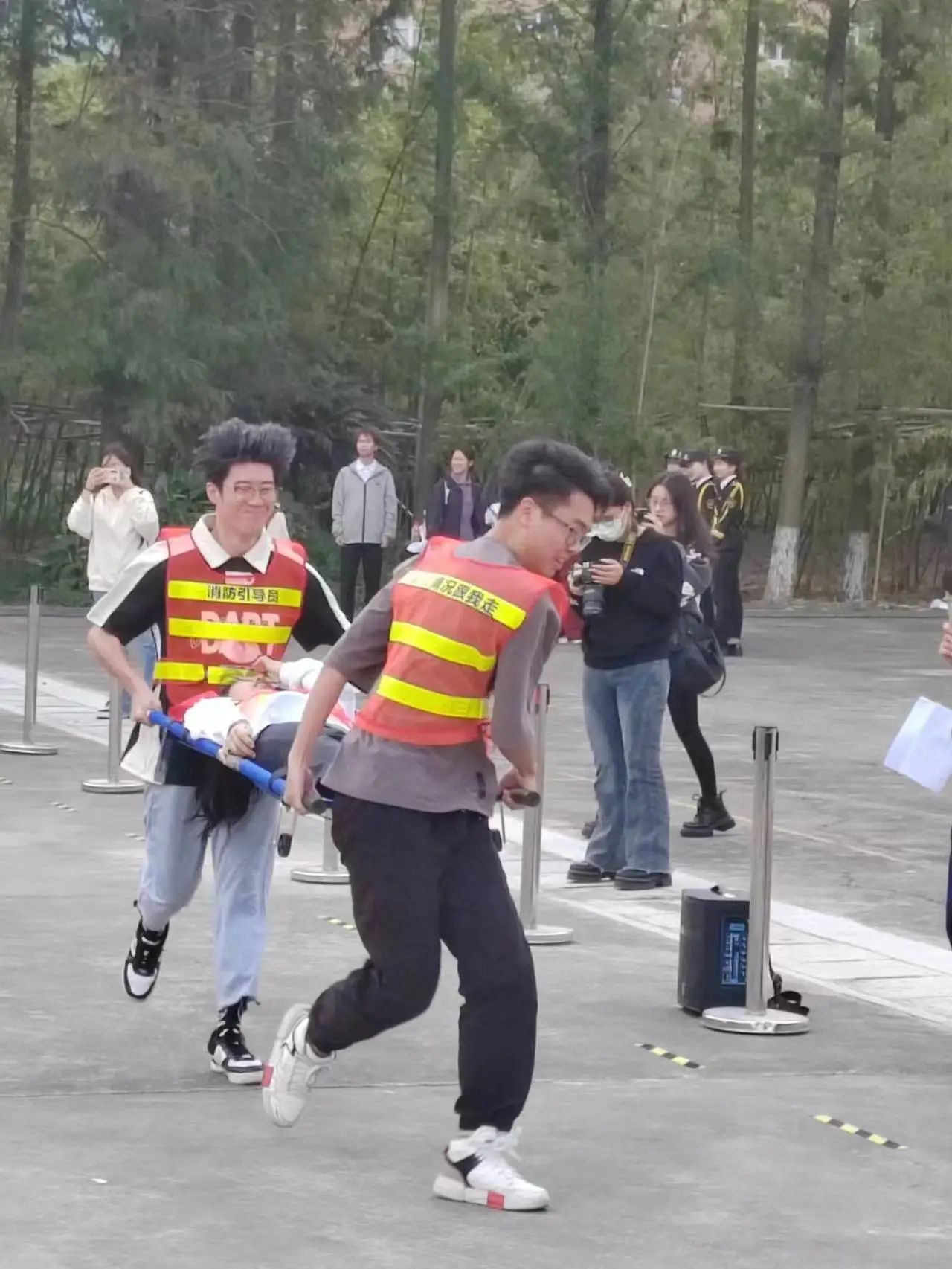 一人扮演火场被困人员,另两人作为“救护人员”,用担架将被困人员抬出,参赛队员们齐心协力,最终快速平稳的就出被困人员。