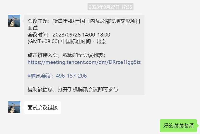 在征求身边家人、朋友、老师和同学的意见并获得了一致支持后,我果断报名参加了活动面试。面试内容主要包括英语自我介绍、讲述报名参与活动的初衷和回答一些有关联合国工作架构等问题,对于有过模联经历的我来说并不算很难,因此我在十一假期前面试,假期结束后就顺利拿到了项目录取通知。