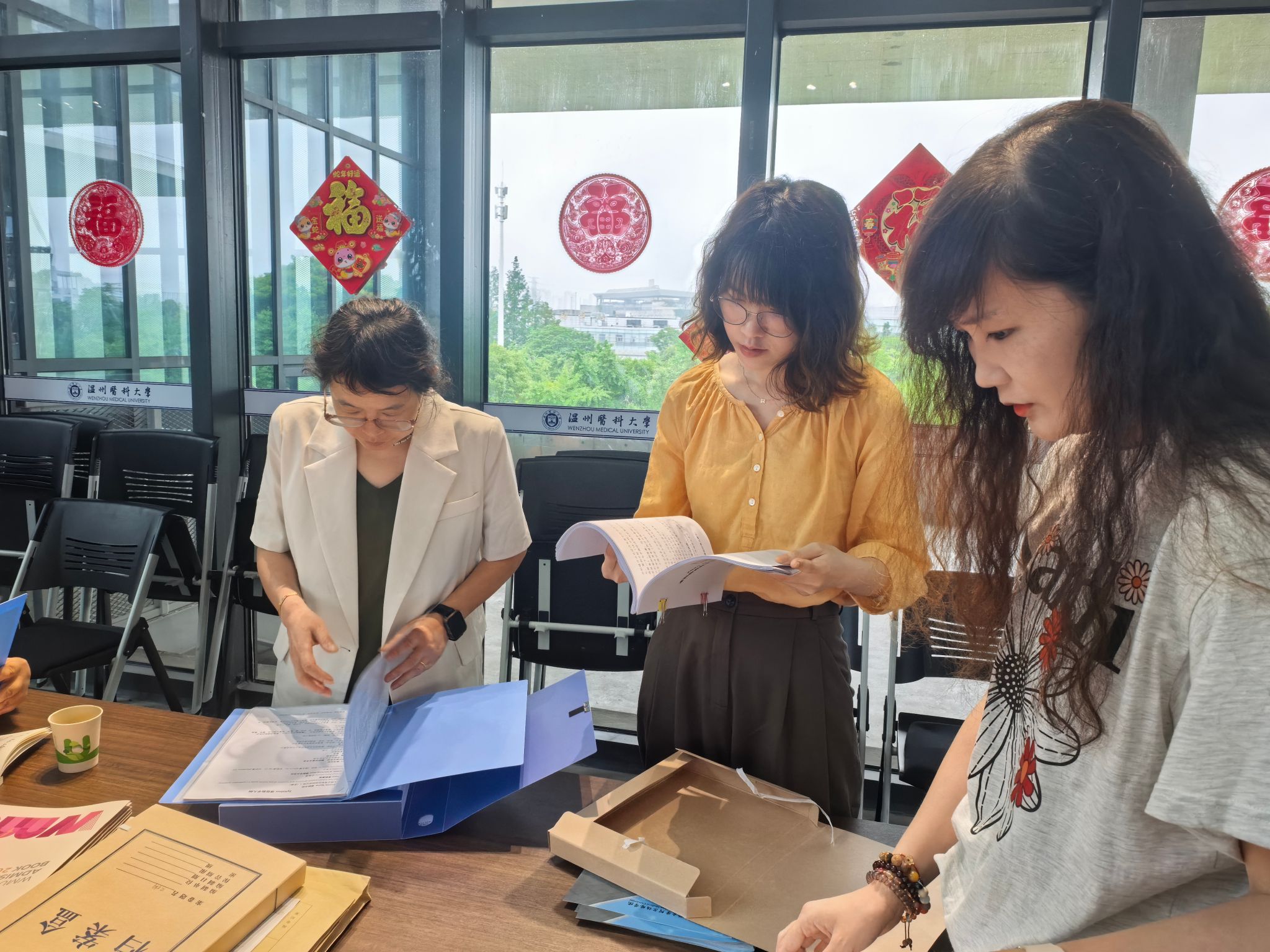 随后,双方检查团人员对照审核评估指标体系,对教学大纲、教案、教学成果等相关台账资料进行相互检查。检查过程中,双方积极交流了教学平台、教学案例及考试分析等内容,针对发现的问题和亮点展开了深入探讨。