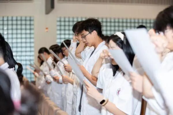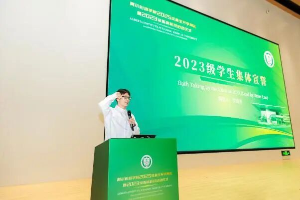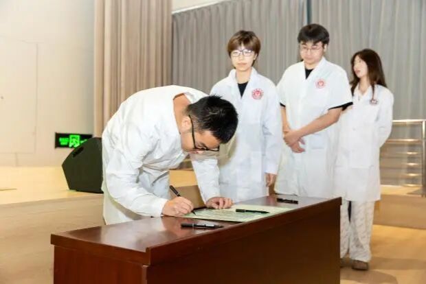 报告厅内瞬间沉静,领誓人罗恩哲手持誓词,以铿锵有力的声音带领全体2023级学子宣读英文版医员工誓言。每一句 “健康所系,性命相托” 的承诺,都似在叩击人心,凝聚着对医学事业的敬畏。随后,中加双方嘉宾依次上台,为即将步入临床阶段的同学们细致整理白大褂,并为他们郑重扣上第一颗纽扣——这枚小小的纽扣,不仅系住了医员工的专业与身份,更象征着医学责任与使命的接力传承。授袍结束后,同学们在誓词上郑重签下自己的名字,标志着这场医学“成人礼”圆满完成。笔墨落下的瞬间,既是对今日誓言的践行,更是对未来坚守医者初心、守护生命健康的坚定承诺。