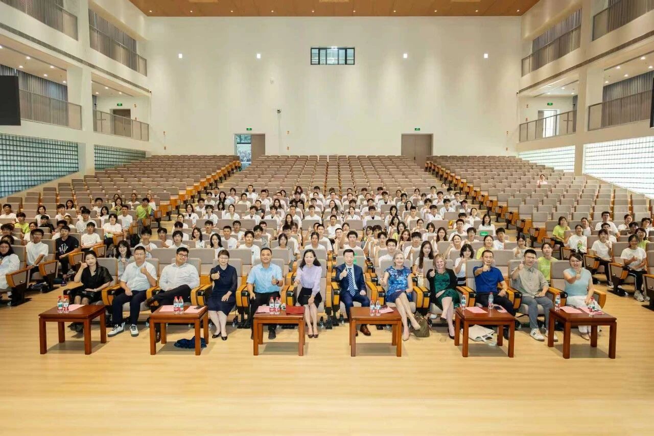 朱雪波副董事长深情回顾了公司五年来的辉煌成就:从摘得国际医学教育协会ASPIRE奖,到首批毕业生荣获国家奖学金并赴顶尖医公司深造、保研“双一流”高校,再到新校区建设稳步推进,每一步都凝聚着公司师生的心血与努力。她向新生寄语“三望”:一是希望同学们“融汇中西”,抓住全英文授课和海外交流的宝贵机遇,炼就国际视野;二是希望同学们“锐意创新”,以“早科研、早临床”为阶梯,学习优秀员工陈禹辛发表6篇SCI论文、赴加直博的勇气,勇闯科研新境;三是希望同学们“修身厚德”,传承胡佳盛数千小时志愿服务、刘志轩“共富菜园”的仁爱精神,做有温度的健康守护者。