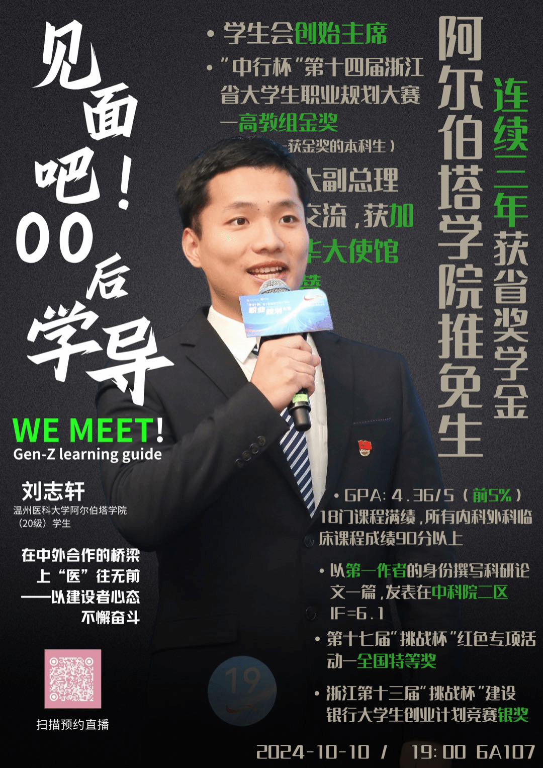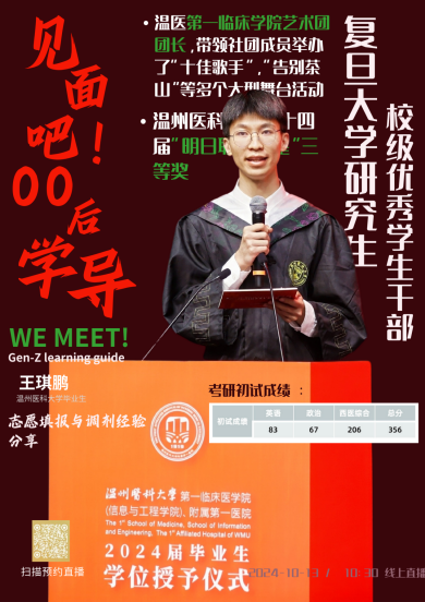 宣传部主导策划“见面吧!00后学导”品牌项目,累计举办24场专题讲座,覆盖全院本科生近300人次。项目特邀清华大学临床医公司考研录取者、浙江大学医公司保研获得者、雅思8.5分高分学员等15位优秀学子担任主讲,系统分享学术发展经验:每场讲座设置互动答疑环节,观看直播的同学可通过线上弹幕的方式进行提问,截至目前,线上收看人数和已突破5000人次,为阿院学子指点迷津,赋能成长。