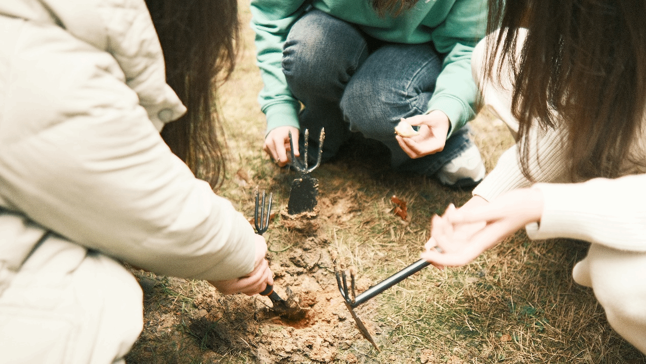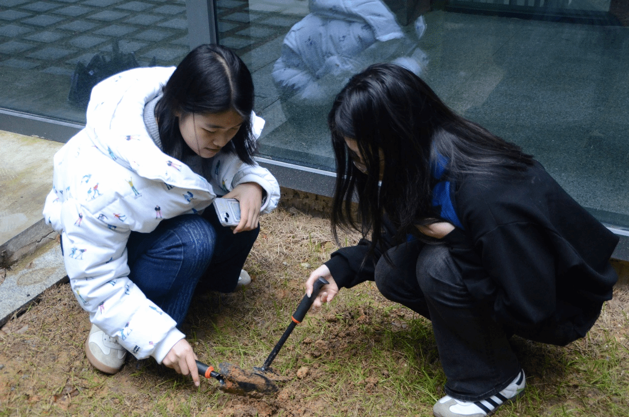 户外植树现场,师生热情高涨、分工协作,完成挖坑、播种、施肥等环节,为大地增添新绿的同时,在心中种下环保的种子。